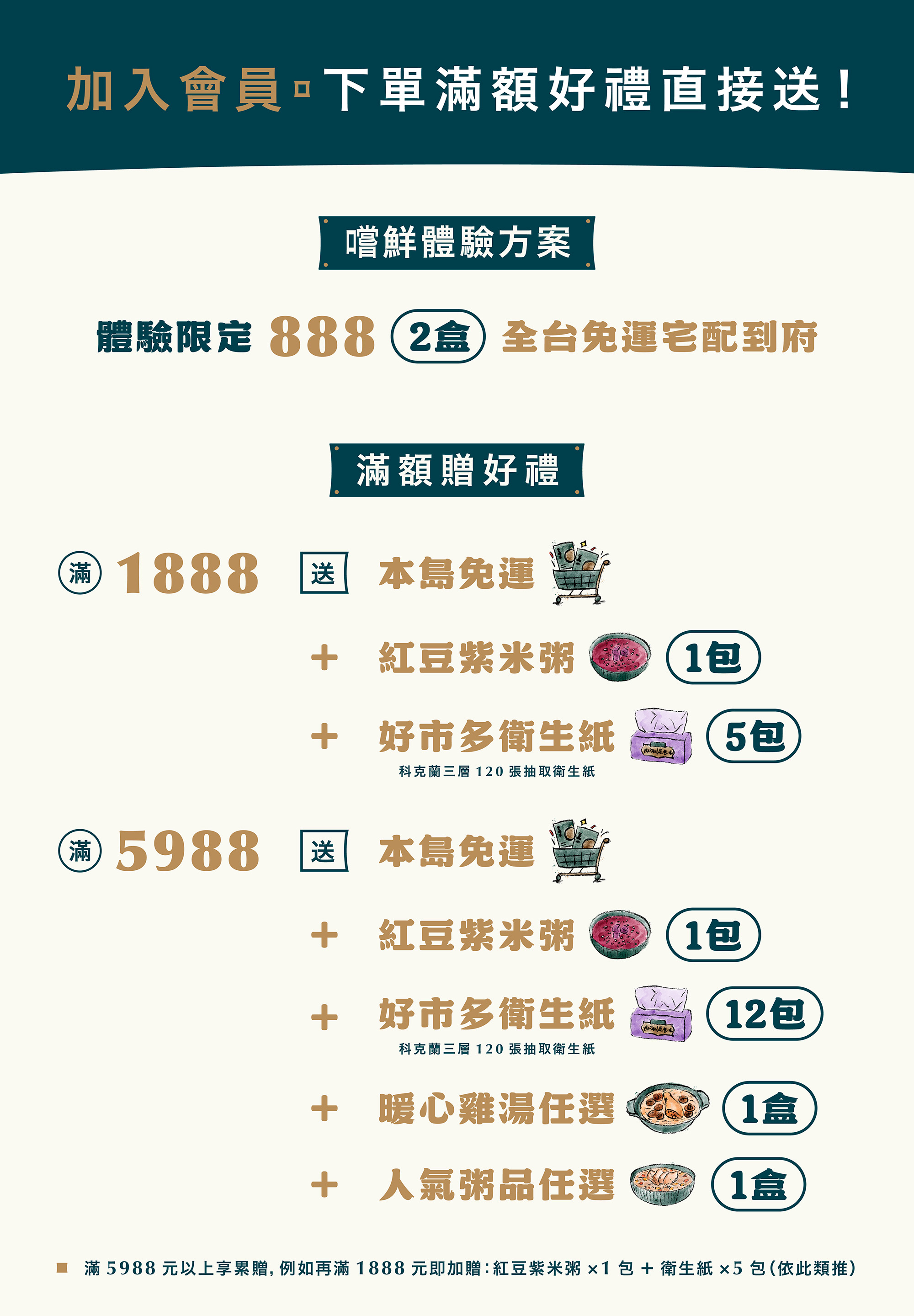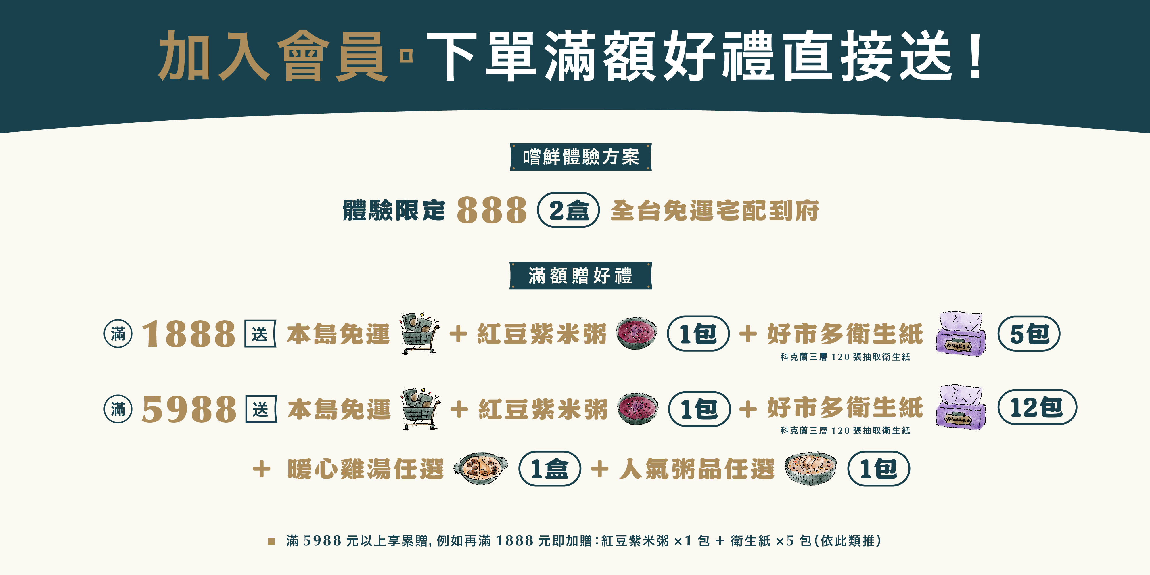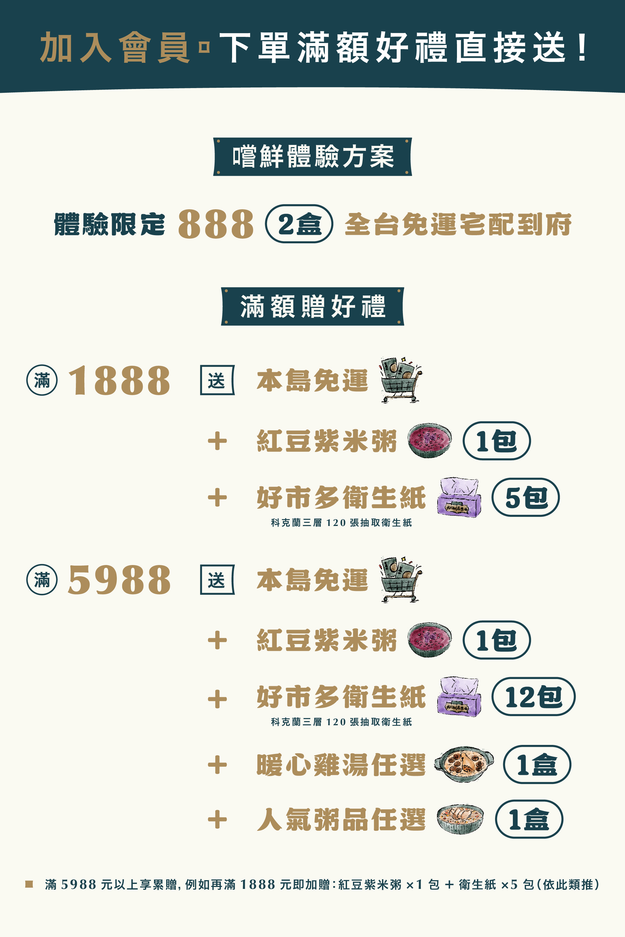 A:台灣本島地區滿 1,888 元免運費,離島地區滿 2,490 元免運費。