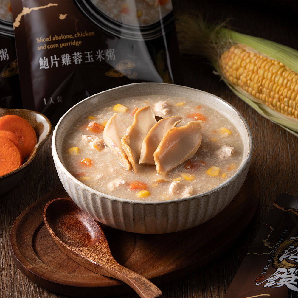 金黃玉米香氣與鮮美雞蓉交織,融入頂級鮑片的海洋鮮韻,呈現細緻柔滑的高雅粥品。選用台灣在地玉米與國產雞肉,搭配精選鮑片慢火燉煮,粥底綿密滑順,鮮香濃郁卻不膩口。開封即食,無需久等即可品嚐海陸交融的奢華層次。每一口都是營養與美味的完美平衡,溫潤入喉,回甘於心。
